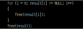 - Frees the memory allocated to each individual string pointed to by result[i].