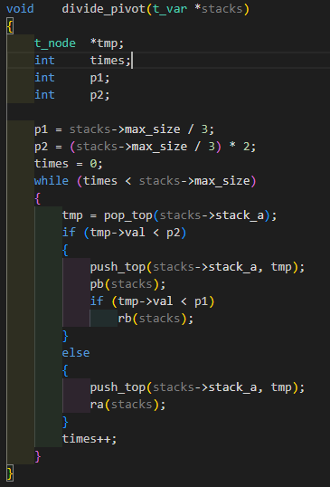 이러한 방식으로, 함수는 효율적으로 스택을 세 부분으로 나누면서 동시에 큰 값들을 스택 A에 유지하고 정렬을 위한 기초 작업을 수행합니다.