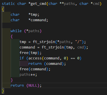 - ft_strjoin(tmp, cmd): 디렉토리 경로(tmp)와 명령어 이름(cmd)을 결합합니다.